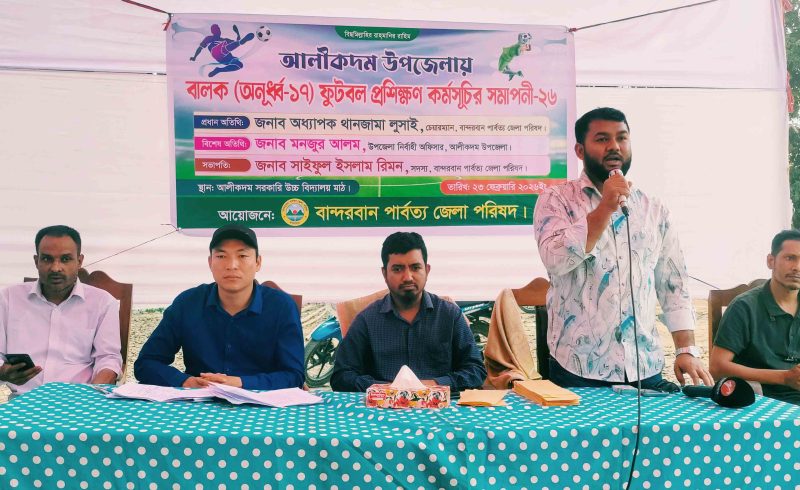 বান্দরবান পার্বত্য জেলা পরিষদের উদ্যোগে আলীকদমে আয়োজিত ১০ দিনব্যাপী অনূর্ধ্ব-১৭ বালক ফুটবল প্রশিক্ষণ–২০২৬ কর্মসূচির সমাপনী অনুষ্ঠান সম্প্রতি অনুষ্ঠিত হয়েছে।