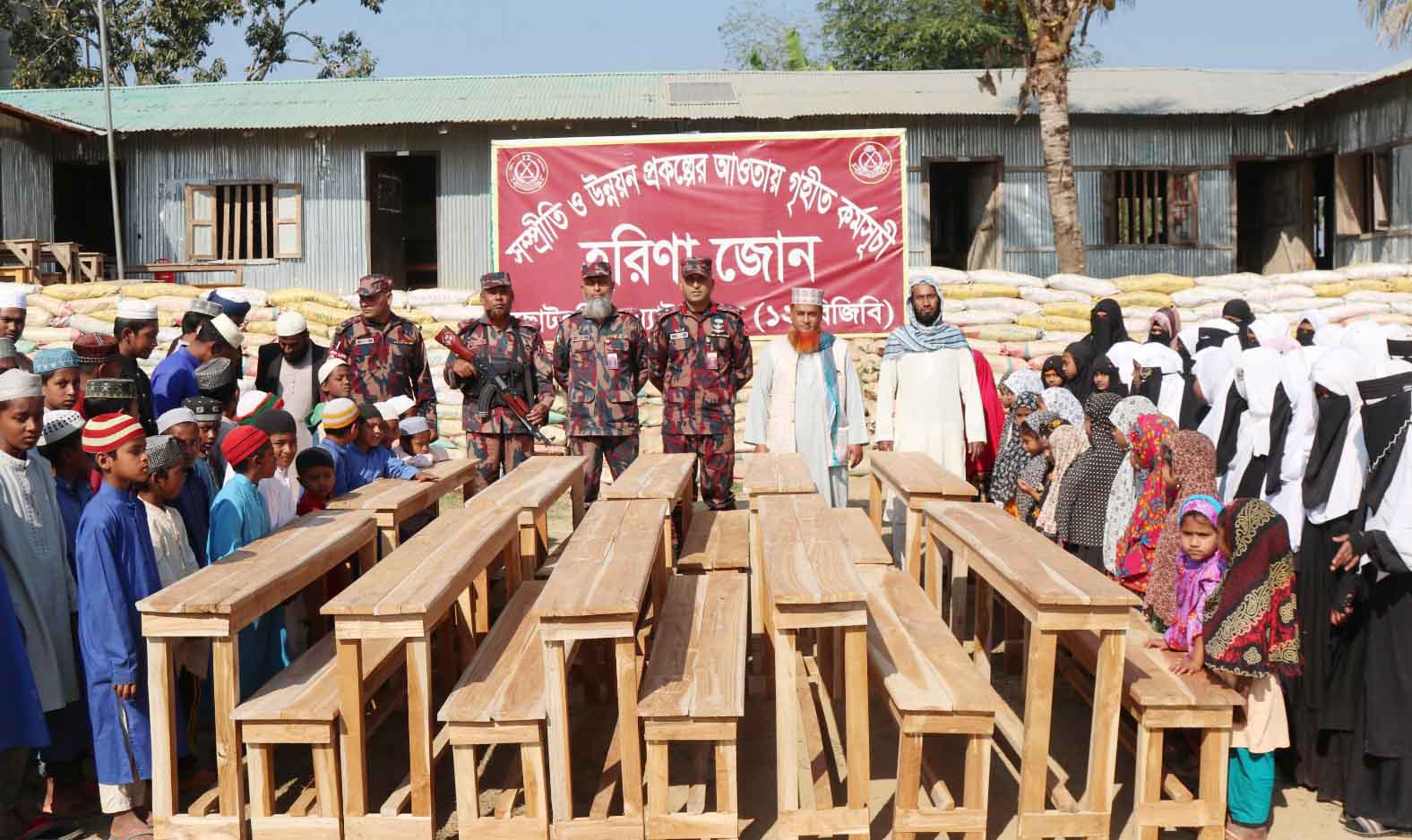 মাদ্রাসার ছাত্রছাত্রীদের তুলনায় বসার ব্যবস্থা অপ্রতুল হওয়ায় ১২ বিজিবি জোন ৭৬ হাজার টাকা আর্থিক সহায়তা ও অনুদান দিয়েছে। বিতরণ কার্যক্রম সকাল ১০টায় মাদ্রাসার মাঠে সম্পন্ন হয়।