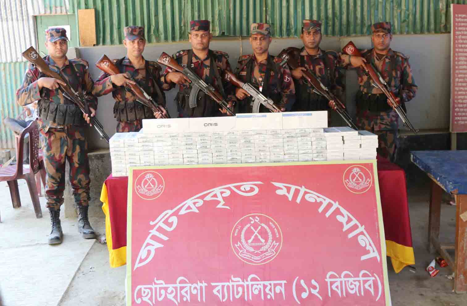 বিজিবির ১২ ব্যাটালিয়নের ছোট হরিনা জোনের একটি টহল দল আমতলা গ্রামের একটি মসজিদের পাশের বাড়ির একটি কক্ষে তল্লাশি চালিয়ে ORIS ব্র্যান্ডের ১,৩০০ প্যাকেট এবং PATRON ESSE Light ব্র্যান্ডের ৪৮০ প্যাকেটসহ মোট ১,৭৮০ প্যাকেট সিগারেট জব্দ করে। জব্দকৃত সিগারেটের আনুমানিক বাজারমূল্য প্রায় ৬ লাখ ৬৪ হাজার টাকা বলে জানায় বিজিবি।