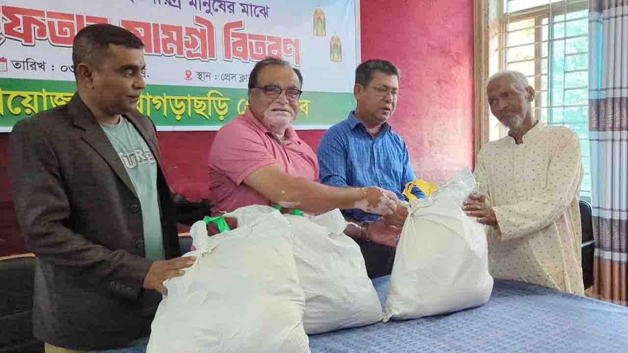 রমজানের পবিত্রতা ও মানবিকতার বার্তা ছড়িয়ে দিতে খাগড়াছড়ি প্রেসক্লাব মঙ্গলবার সকালে দরিদ্র ও অসহায় পরিবারের মধ্যে ইফতার সামগ্রী বিতরণ করেছে। প্রেসক্লাবের সম্মেলন কক্ষে আয়োজিত অনুষ্ঠানে উপকারভোগীদের হাতে ছোলা, তেল, মুড়ি, পেঁয়াজ, আলু, সেমাইসহ নিত্যপ্রয়োজনীয় খাদ্যসামগ্রী তুলে দেওয়া হয়।