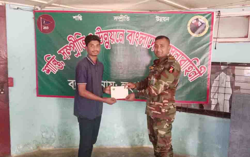 লংগদু জোনের জোন কমান্ডার লেফটেন্যান্ট কর্নেল মীর মোর্শেদ (এসপিপি, পিএসসি)-এর পক্ষে জোনের উপ-অধিনায়ক মেজর মো. শাহিনুর আল সাকিব (পিএসসি) শিক্ষার্থী সোহাগ হোসেনের হাতে নগদ অর্থ তুলে দেন।