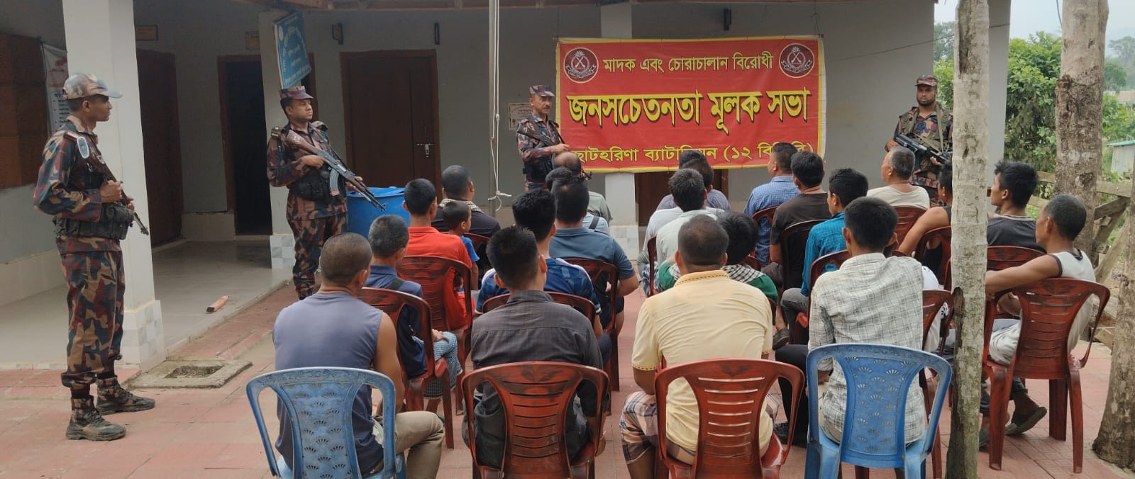 ১৭ এপ্রিল শুক্রবার সকাল ৯টায়, ছোটহরিণা ব্যাটালিয়ন (১২ বিজিবি)’র দায়িত্বপূর্ন বড় হরিনা এলাকায় বড় হরিনা বিজিবি ক্যাম্পের ক্যাম্প কমান্ডার এর সভাপতিত্বে স্থানীয় জনসাধারণ ও গণ্যমান্য ব্যক্তিবর্গের উপস্থিতিতে জনসচেতনতামূলক সভা আরম্ভ হয়। উক্ত জনসচেতনমূলক সভায় বর্তমান জ্বালানি সংকটে সীমান্তে জ্বালানি তেল পাচার, মজুদ,মাদক পাচার ও বিভিন্ন বিষয়ে গুজব, বিভ্রান্তি ও সহিংসতা থেকে দূরে থেকে শান্তিপূর্ণ পরিবেশ সম্পর্কে স্থানীয় জনসাধারণকে প্রেষণা প্রদান করা হয়। এলাকার জনসাধারণকে অবৈধ মজুদদারি, মাদক সেবনের ফলে শারীরিক, মানসিক, অর্থনৈতিক ও সামাজিক ক্ষতিকারক দিক ও এর কুফল সম্পর্কে বিস্তারিত আলোচনা করা হয়। এলাকায় কোন অপরিচিত লোকের সন্দেহজনক চলাচল পরিলক্ষিত হলে বিজিবিকে অবহিত করার জন্য নির্দেশনা প্রদান করা হয়। শান্তি, সম্প্রীতি ও উন্নয়নের ধারাবাহিকতা রক্ষায় বাঙ্গালী ও পাহাড়ীদের মধ্যে মিলেমিশে থাকার ব্যাপারে পরামর্শ দেয়া হয়। এলাকায় যেন কোন চাঁদাবাজি না হয় সেই সম্পর্কে আলোচনা করা হয়।
