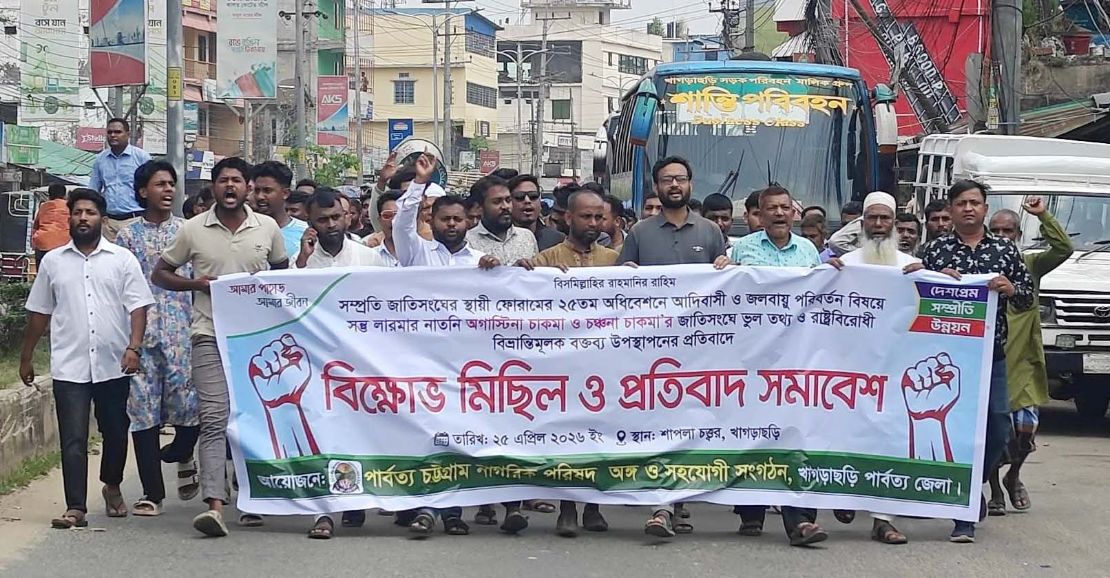 পার্বত্য চট্টগ্রাম পরিস্থিতি নিয়ে আন্তর্জাতিক পরিসরে উত্থাপিত বক্তব্যের প্রতিবাদে খাগড়াছড়িতে বিক্ষোভ মিছিল ও সমাবেশ অনুষ্ঠিত হয়েছে।