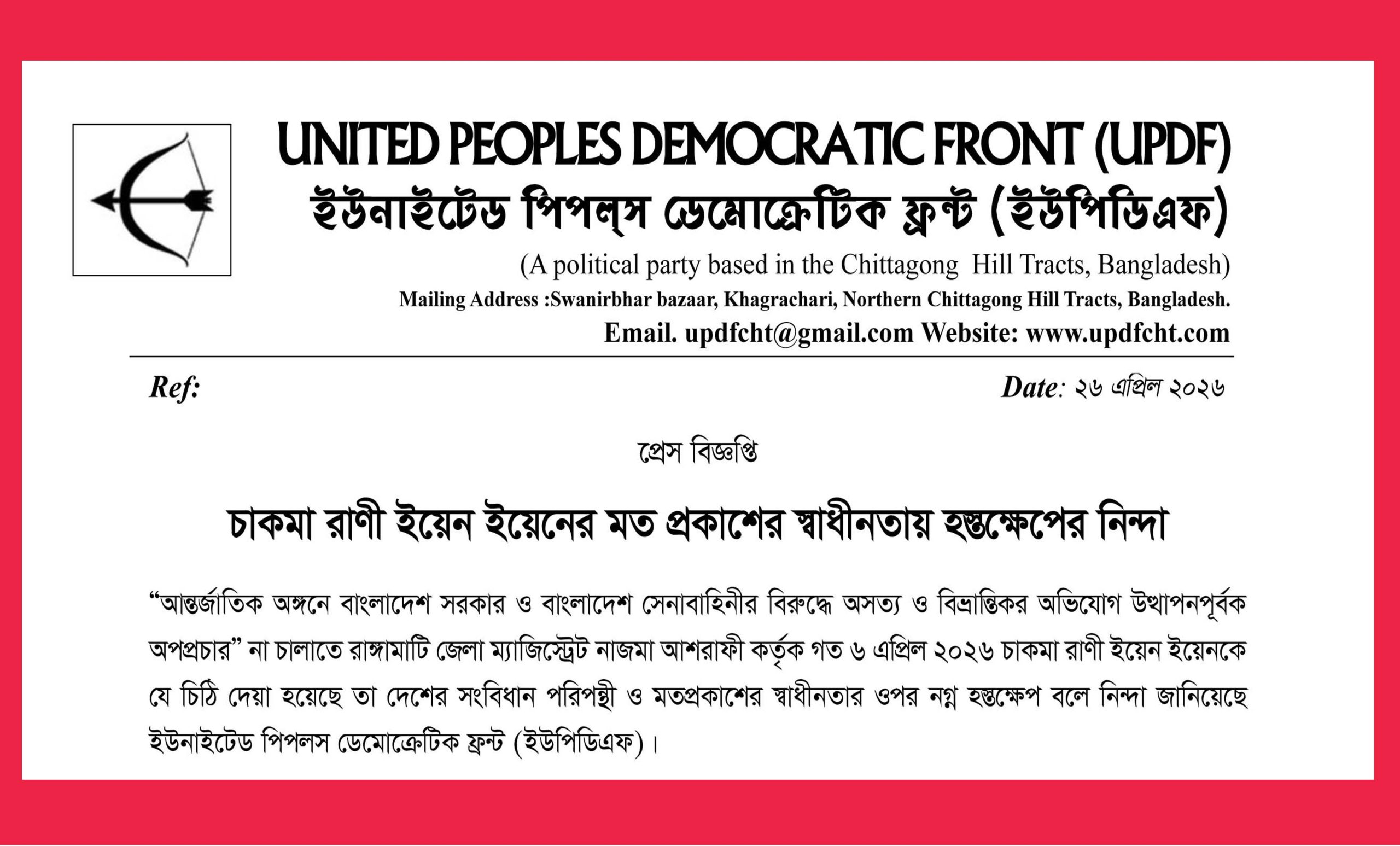 চাকমা সার্কেলের উপদেষ্টা ইয়েন ইয়েনকে “অসত্য ও বিভ্রান্তিকর তথ্য প্রচার থেকে বিরত থাকার” অনুরোধ জানিয়ে রাঙ্গামাটি জেলা ম্যাজিস্ট্রেটের পাঠানো একটি চিঠিকে কেন্দ্র করে উদ্বেগ ও নিন্দা জানিয়েছে পার্বত্য চট্টগ্রামভিত্তিক রাজনৈতিক সংগঠন ইউনাইটেড পিপলস ডেমোক্রেটিক ফ্রন্ট (ইউপিডিএফ)।