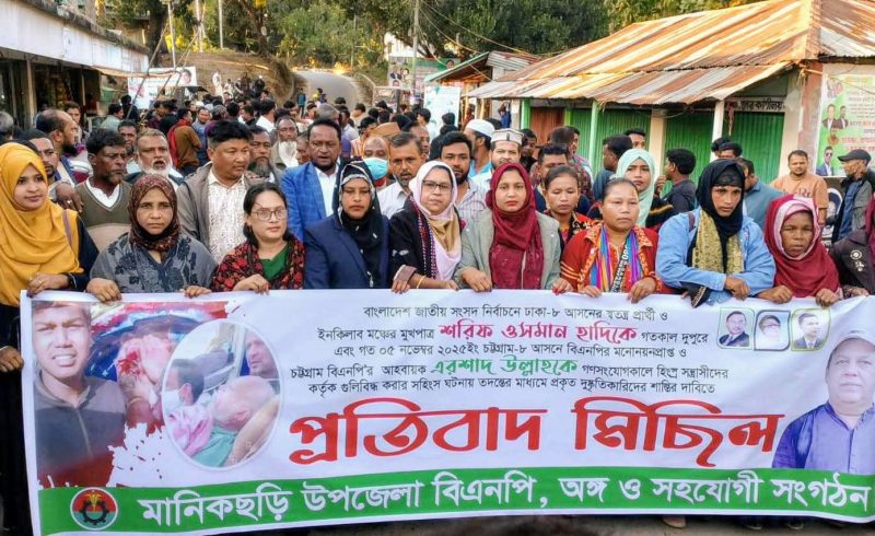 ওসমান হাদিকে গুলি করার প্রতিবাদে মানিকছড়িতে বিএনপির প্রতিবাদ মিছিল
